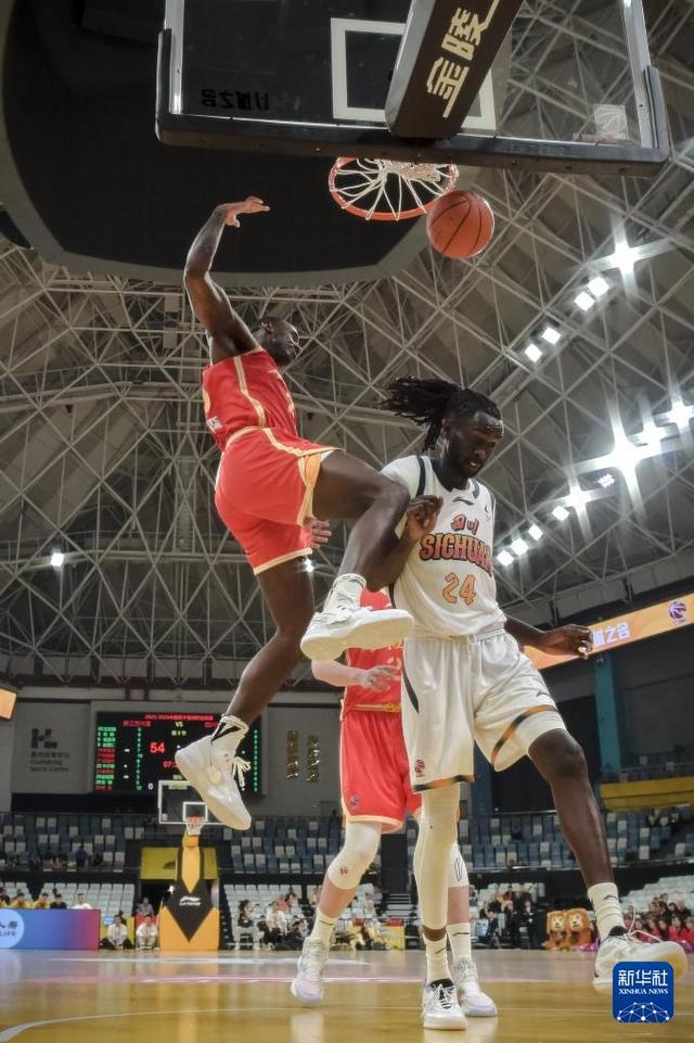 1月15日,四川丰谷酒业队球员加克(上)在比赛中扣篮。新华社记者 江汉 摄
